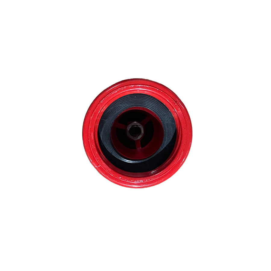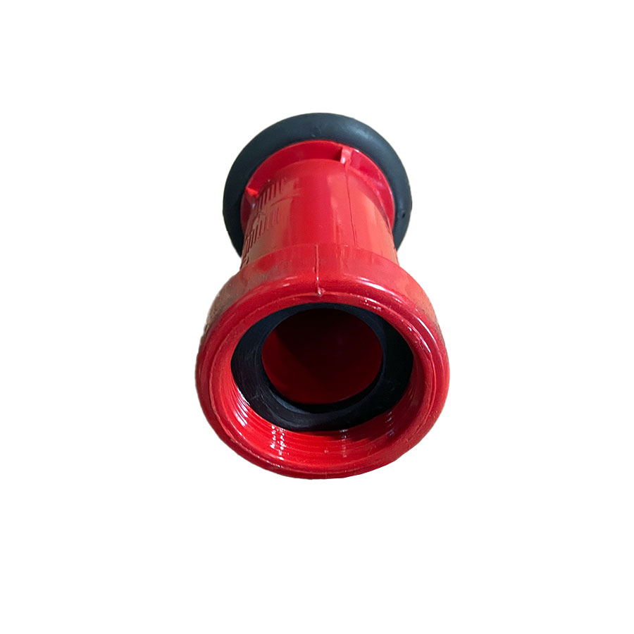 This 1-1/2 inch adjustable spray nozzle is designed for use on the hose reel at the rear of a Ledwell water truck. Made from high-impact red polycarbonate, it features a twist-adjustable design that allows the operator to switch between a straight stream and a wide fog spray pattern for versatile water distribution.